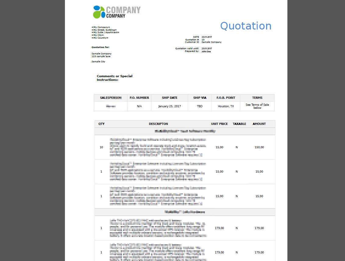 Quotes made with the app can also include additional columns in the product table, such as product description, discount description, etc. The app does not yet support invoices but does support custom fields created in Quotes.