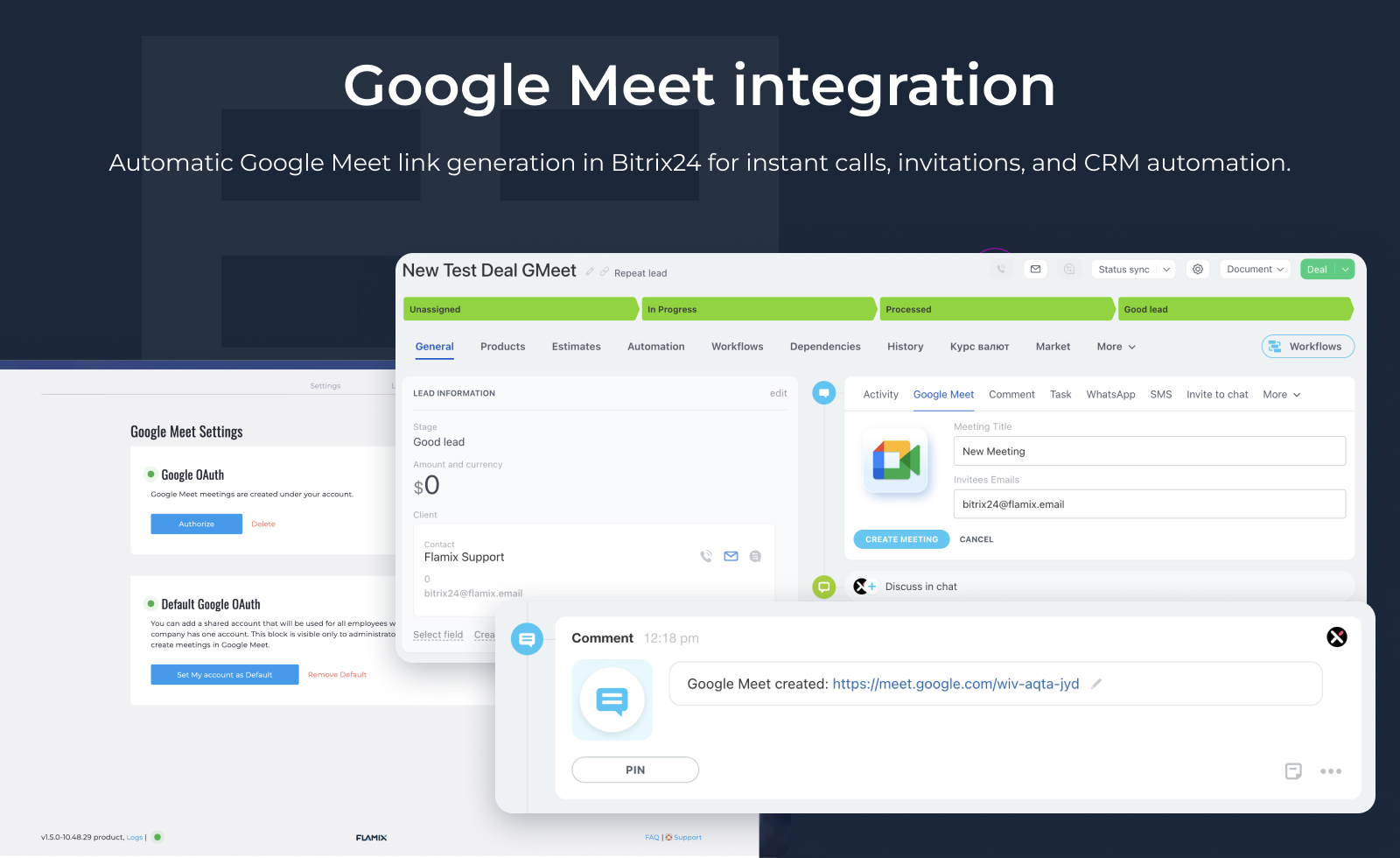 - Quick Meeting Creation: Instantly generate a Google Meet link from any Lead, Contact, Company, or Deal details form in Bitrix24.