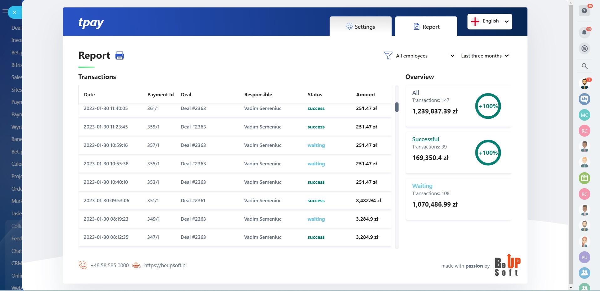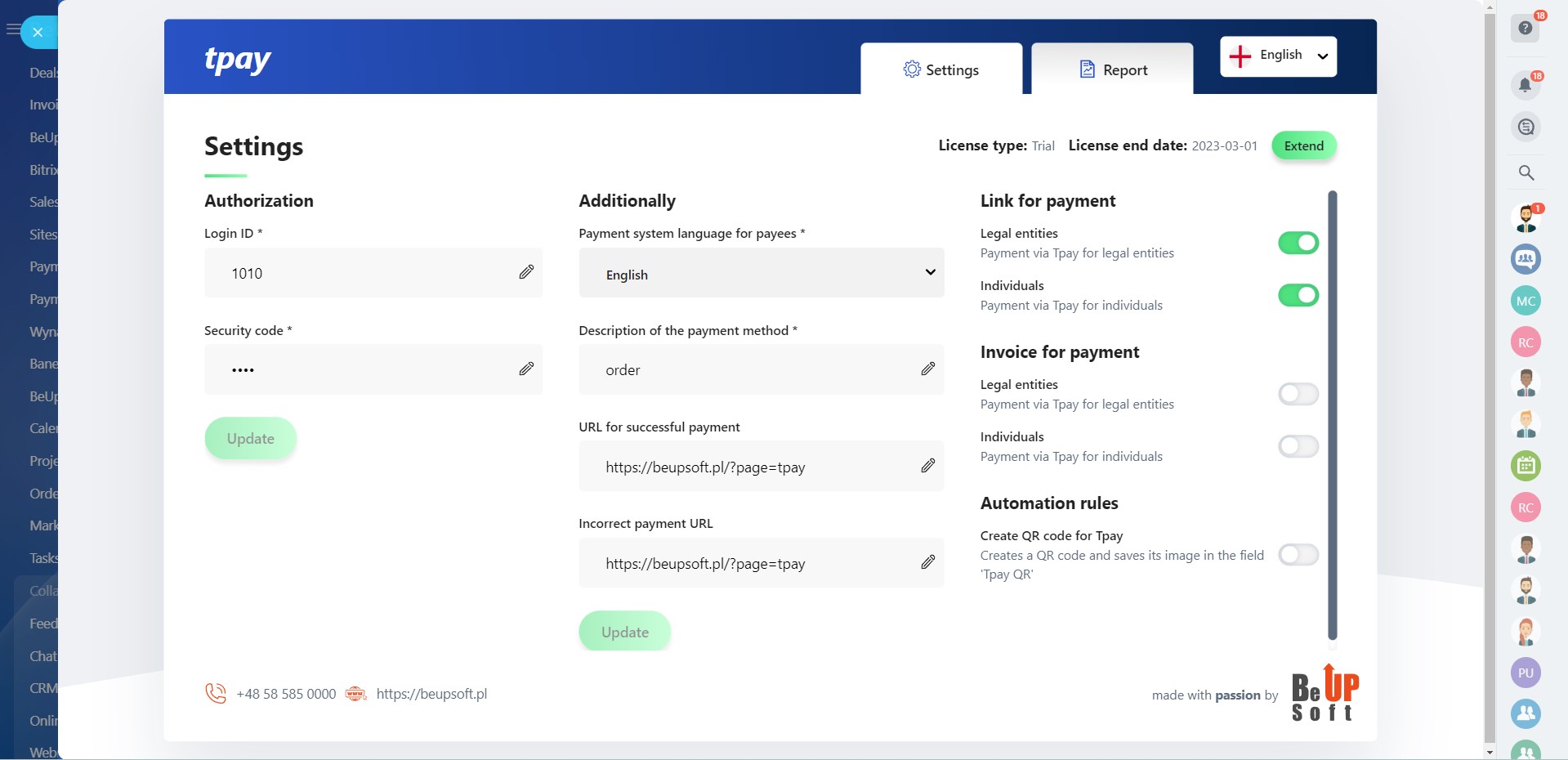tpay - the reliable and secure payment system now available on Bitrix24.Market! With tpay, you can easily and quickly make transactions within the Bitrix24 platform, ensuring a smooth and hassle-free payment process. Tpay system offers a range of payment options, including credit card, bank transfers, and e-wallets, to suit your specific needs. With Tpay advanced security measures, you can rest assured that all your transactions are safe and protected from any potential fraud or data breaches. BeUp Soft team of experts is always on hand to provide top-notch support and assistance, ensuring that you have a seamless experience with tpay.