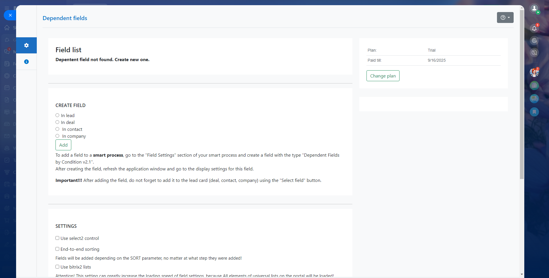 Using the "Basic" tariff is completely free for 7 days of trial period, it includes an unlimited number of nestings when setting up fields, an unlimited number of fields used. The number of fields in leads and deals can be used 1 each. More details about tariffs.