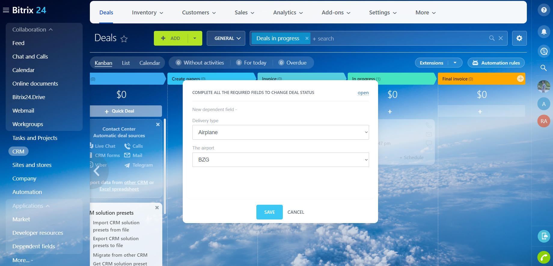 Using the "Basic" tariff is completely free for 7 days of trial period, it includes an unlimited number of nestings when setting up fields, an unlimited number of fields used. The number of fields in leads and deals can be used 1 each. More details about tariffs.