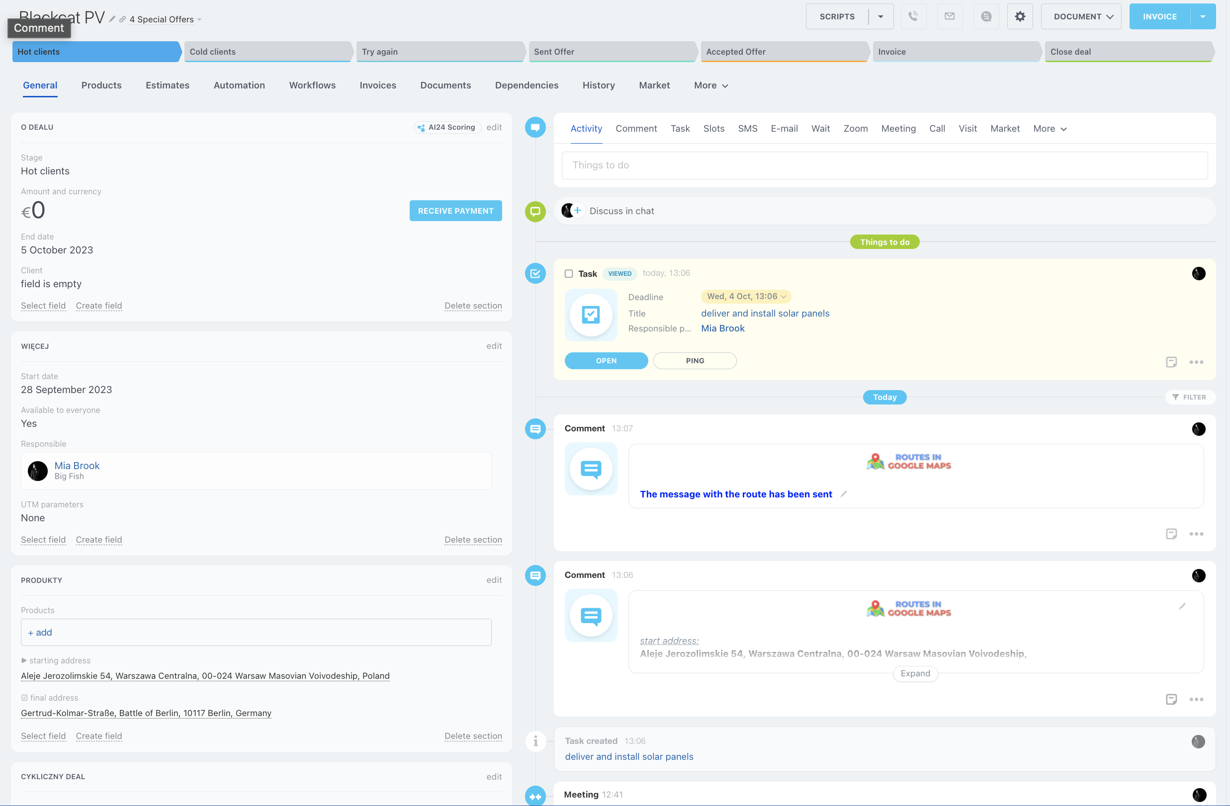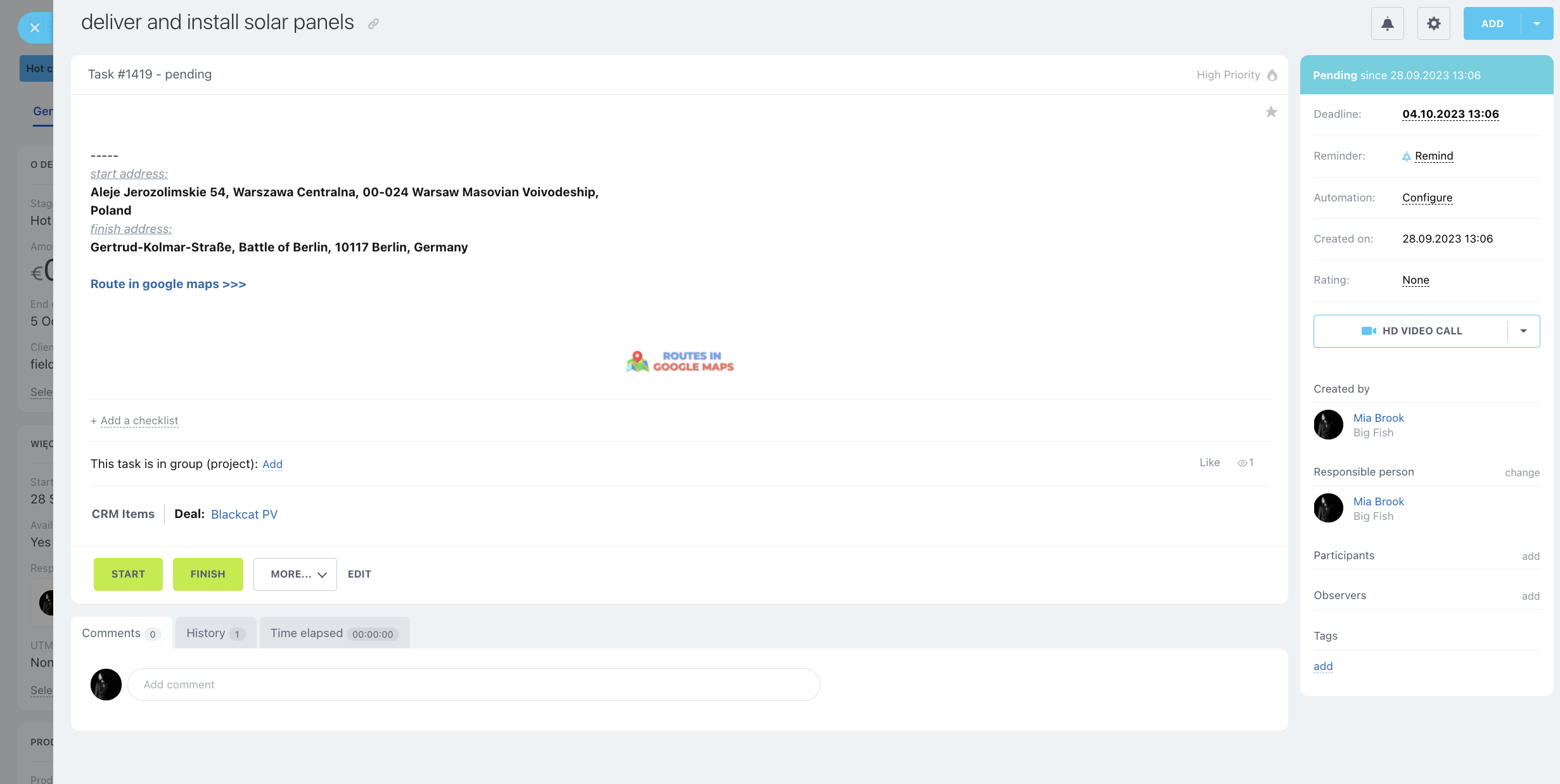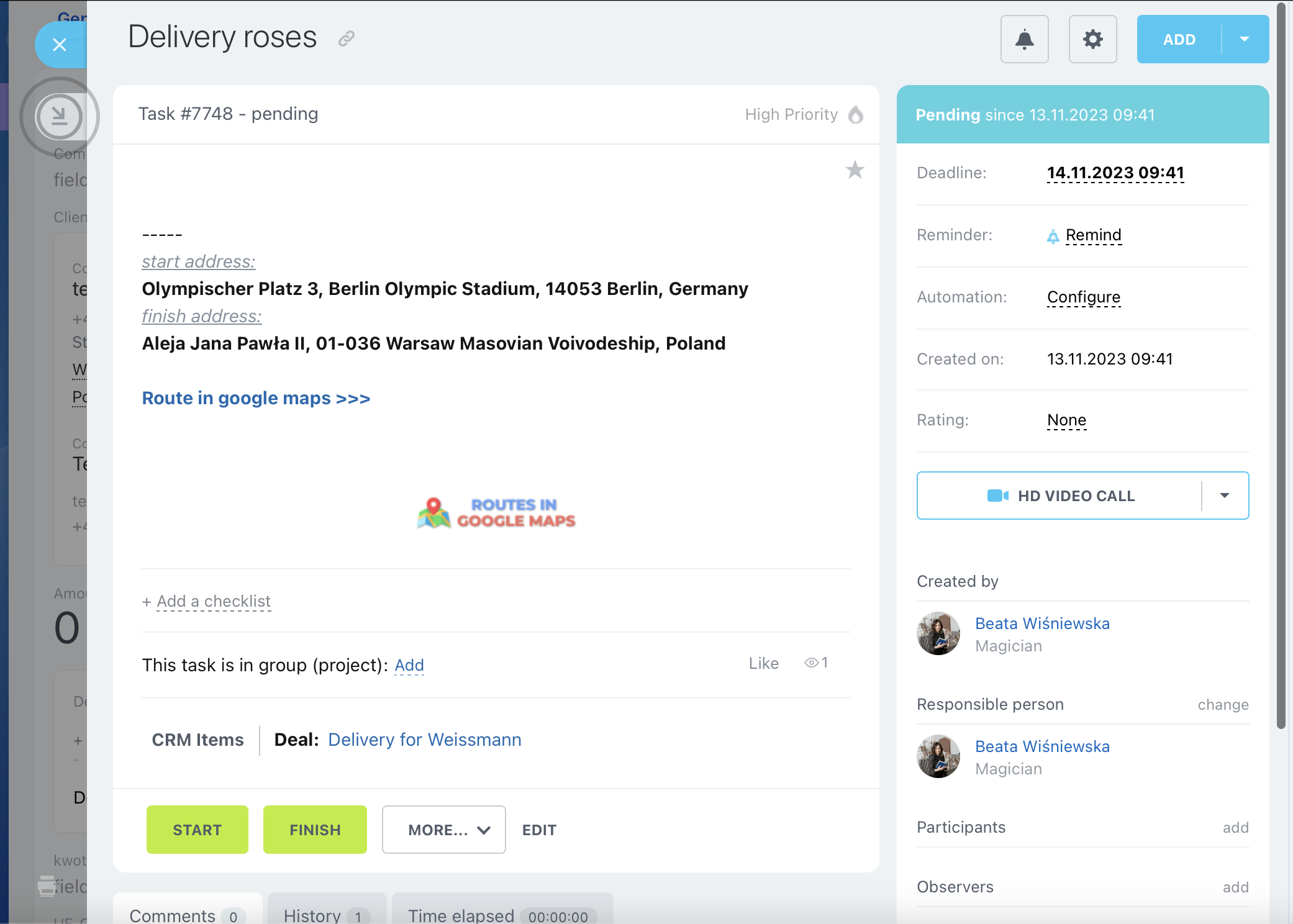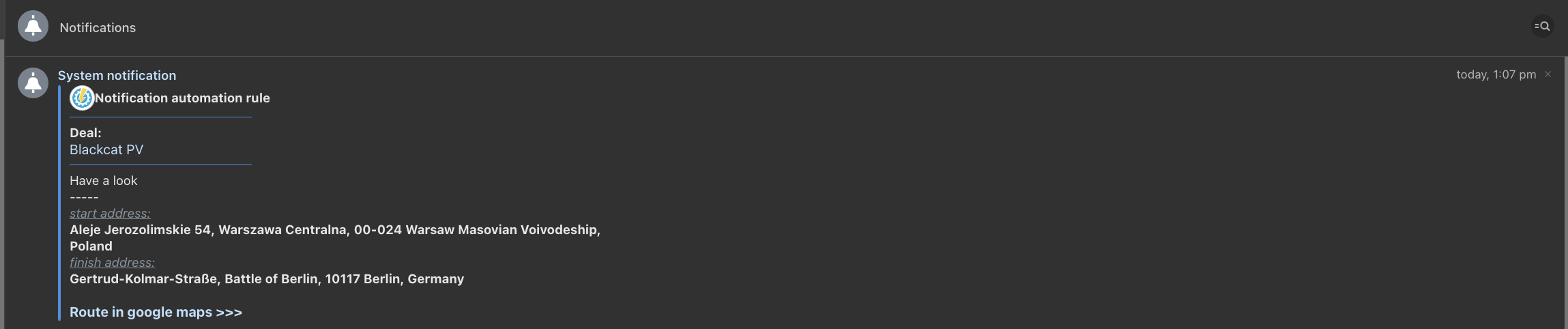 The smart script "Routes in Google Maps" allows you to create a route for two addresses in Google Maps in Bitrix24 deals. Set tasks for employees with a built route.