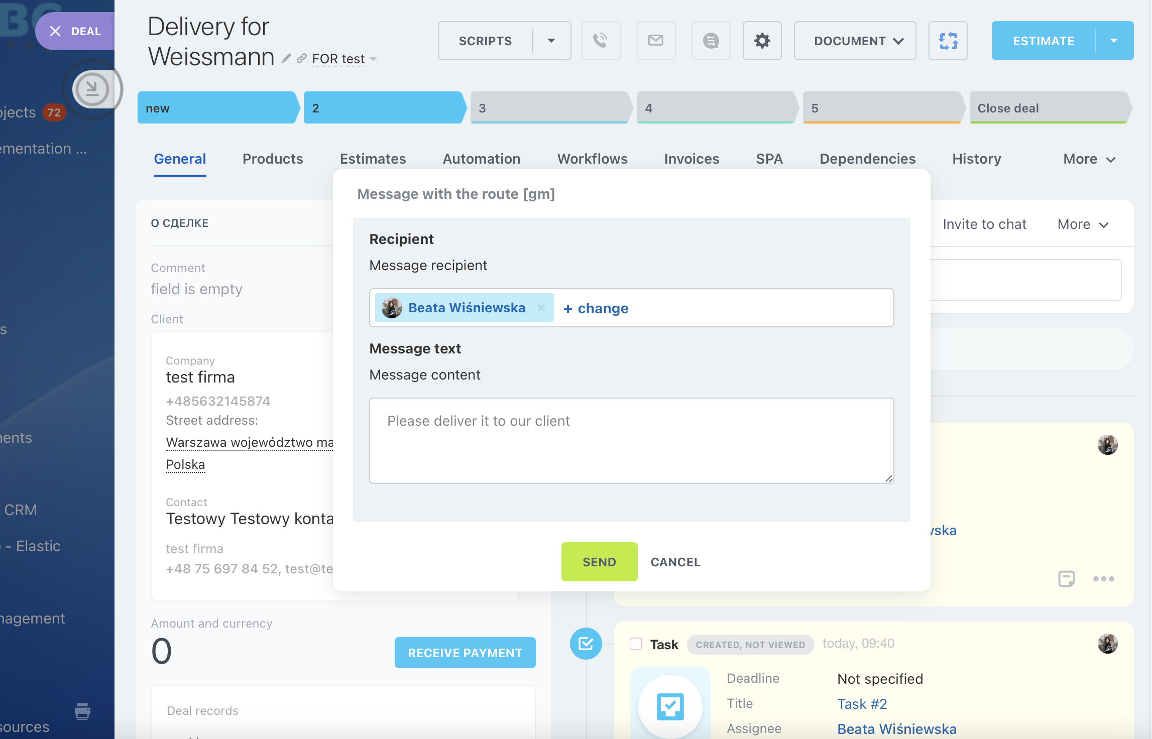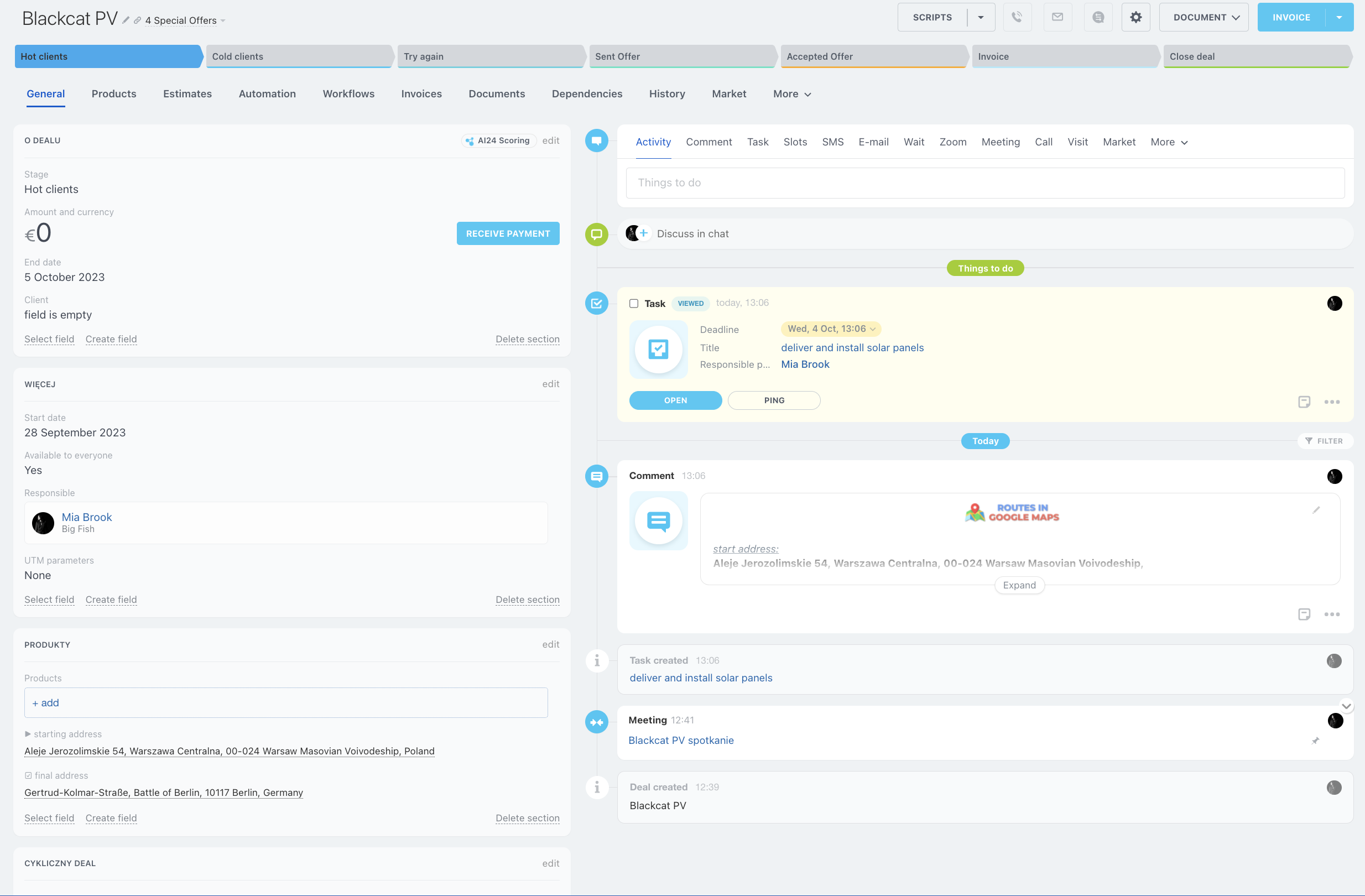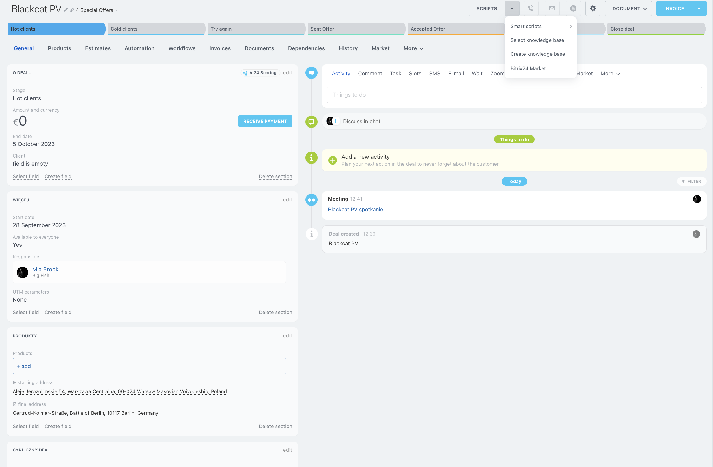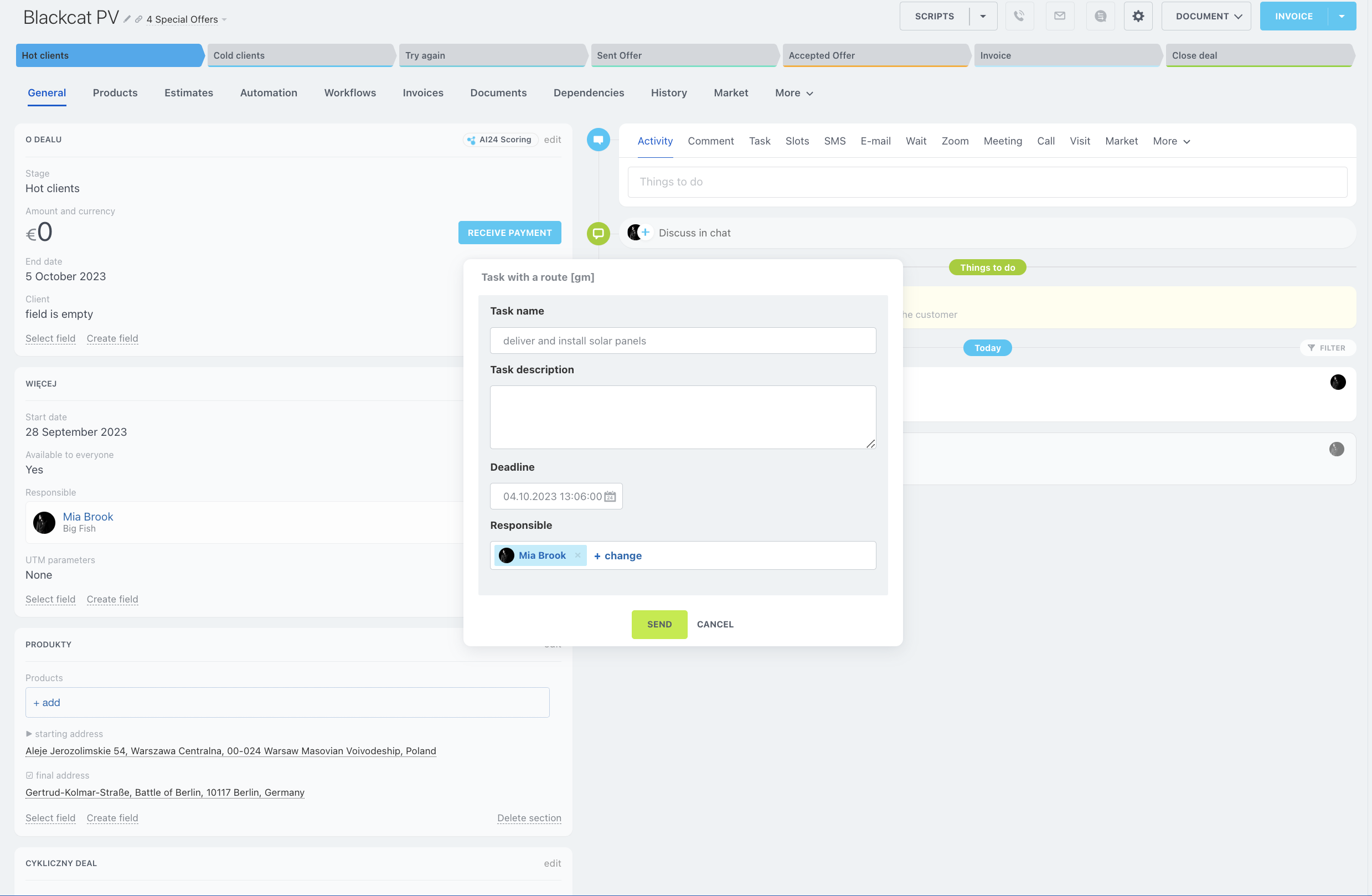 The smart script "Routes in Google Maps" allows you to create a route for two addresses in Google Maps in Bitrix24 deals. Set tasks for employees with a built route.