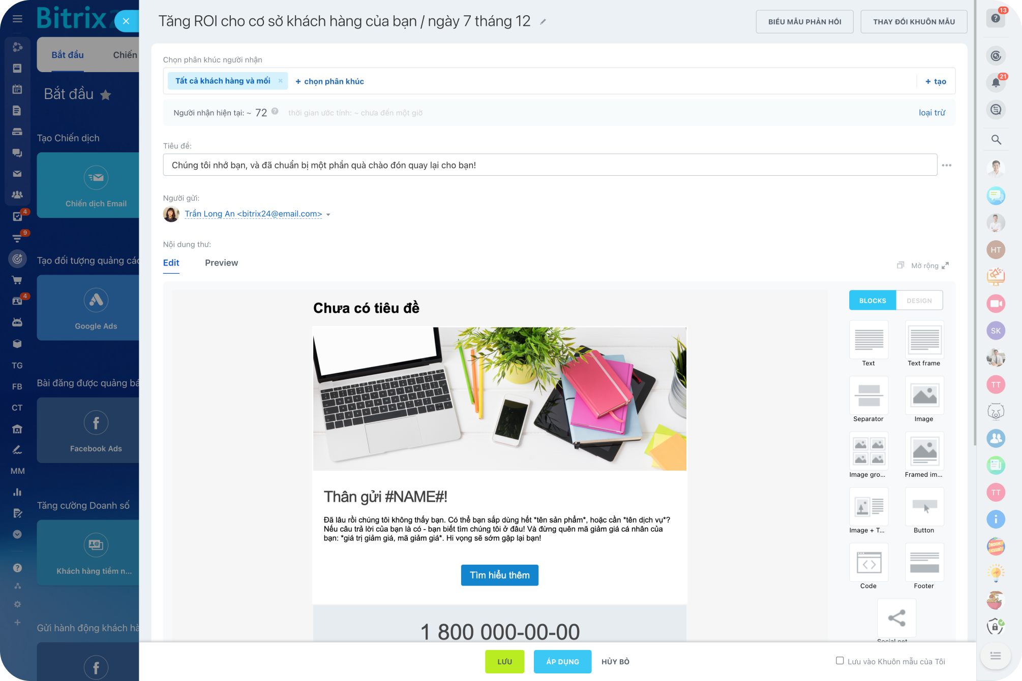 Nhờ Bitrix24, bạn có thể tiếp cận khách hàng theo cách thuận tiện nhất cho họ: email, SMS, điện thoại, mạng xã hội, trang đích đến, v.v. Theo dõi hiệu quả nỗ lực tiếp thị của bạn bằng hệ thống phân tích được tích hợp của chúng tôi.