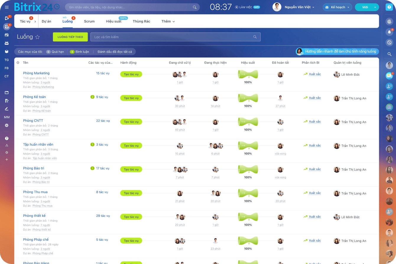 Luồng là một cách thông minh để trực quan hóa những tác vụ liên quan đến một quy trình cụ thể trong công ty hoặc phòng ban của bạn (ví dụ: phê duyệt tài liệu pháp lý). Tạo một luồng để mọi người dễ dàng nắm bắt khối lượng công việc hiện tại và xác định các điểm nghẽn để tăng hiệu suất làm việc.