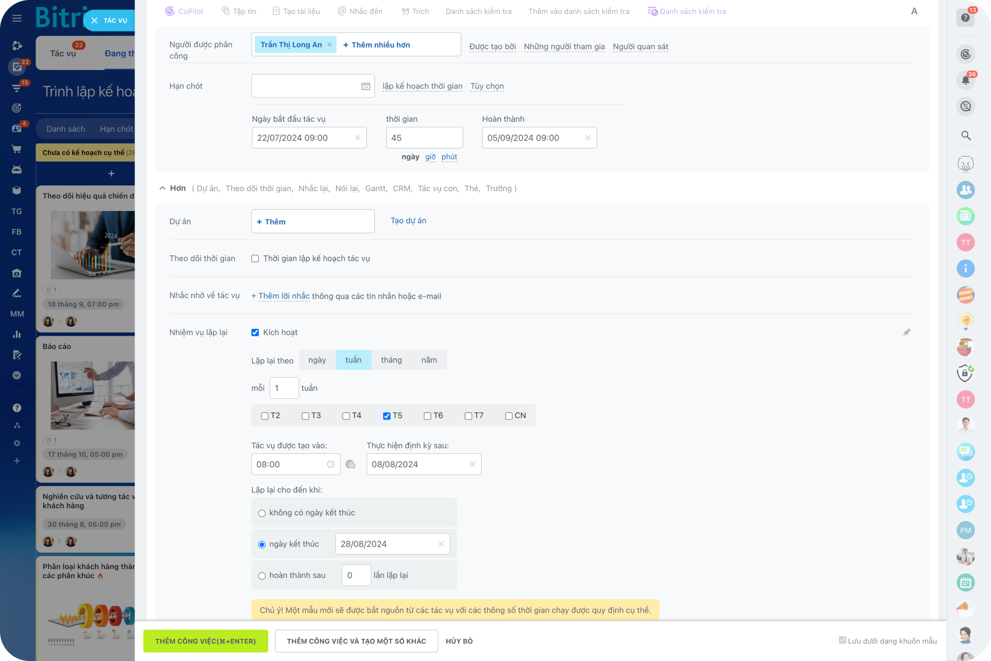 Các tác vụ trong Bitrix24 có thể được thiết lập để lặp lại sau mỗi ngày, mỗi tuần, mỗi tháng, hoặc bất kỳ khoảng thời gian tùy chỉnh nào khác, điều này rất tiện lợi cho việc báo cáo và các hoạt động lặp lại khác.
