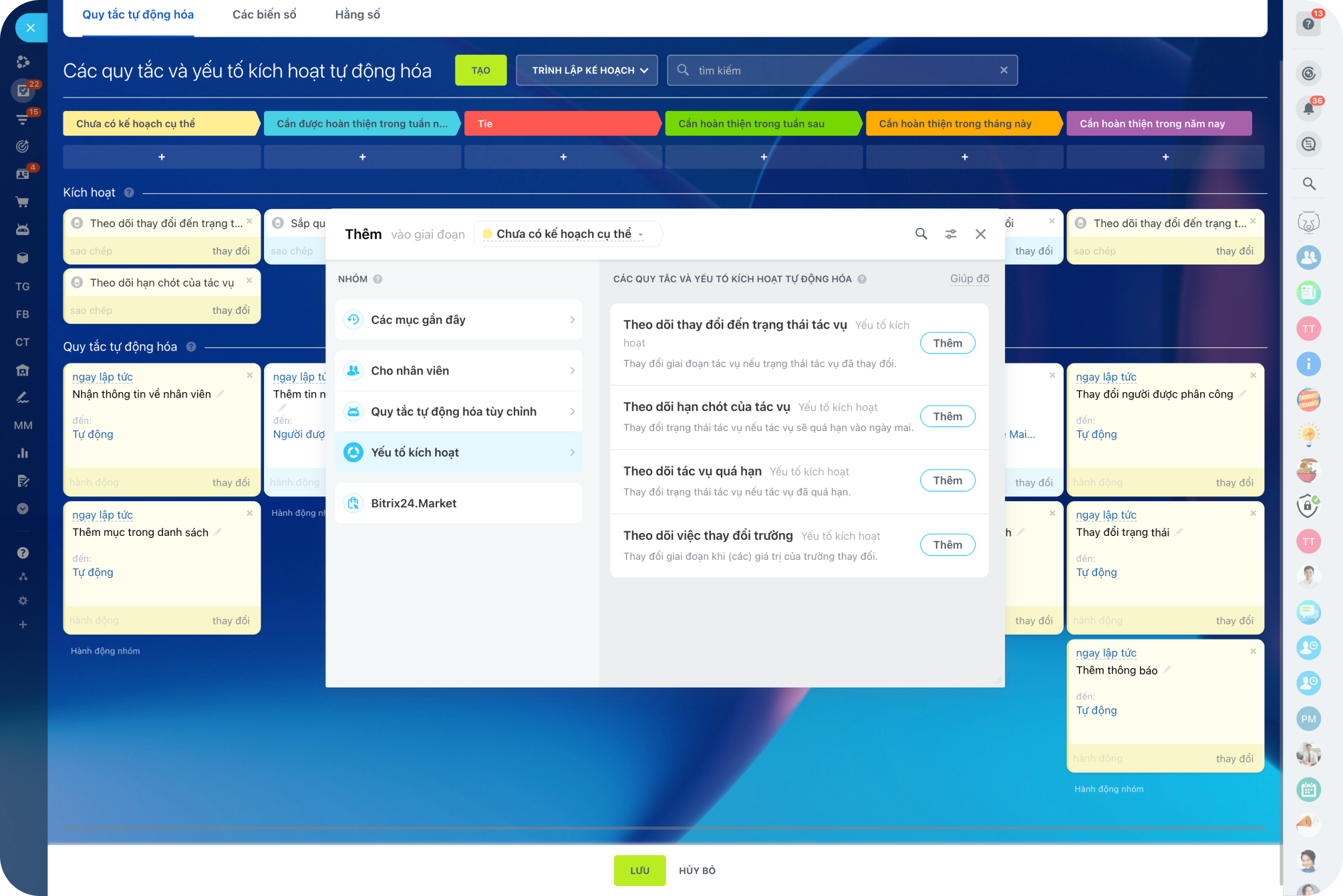 Bạn có thể tự động hóa nhiều loại hoạt động tiêu chuẩn, lặp lại như tạo một tác vụ, thay đổi một giai đoạn trong Kanban, thay đổi trạng thái tác vụ, thay đổi người được phân công, gửi thông báo hay email cho một nhân viên cụ thể, v.v...